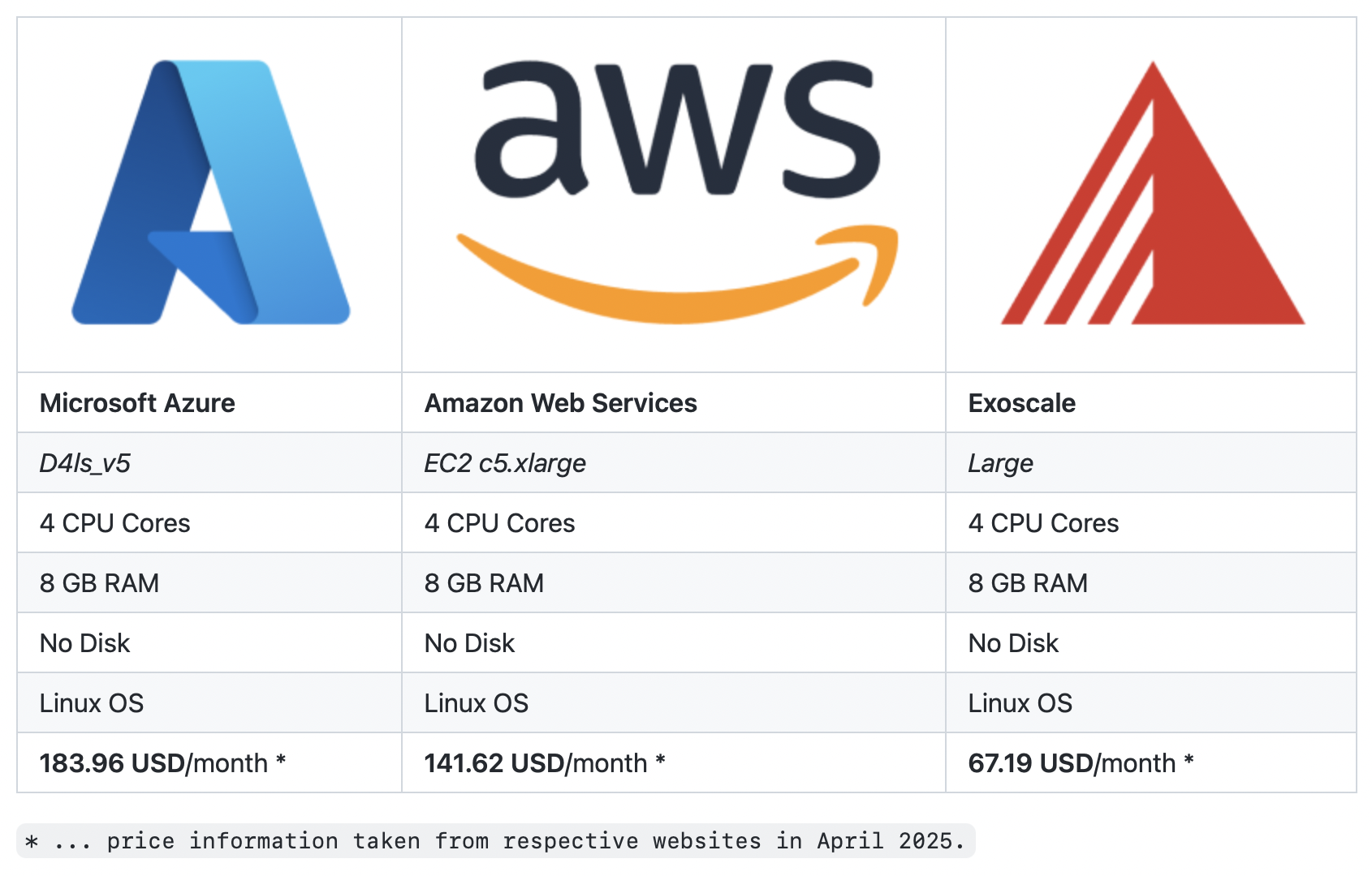 All prices shown are based on what vendors charge for using servers in European data centers, with pay-as-you-go options and no long-term contracts.