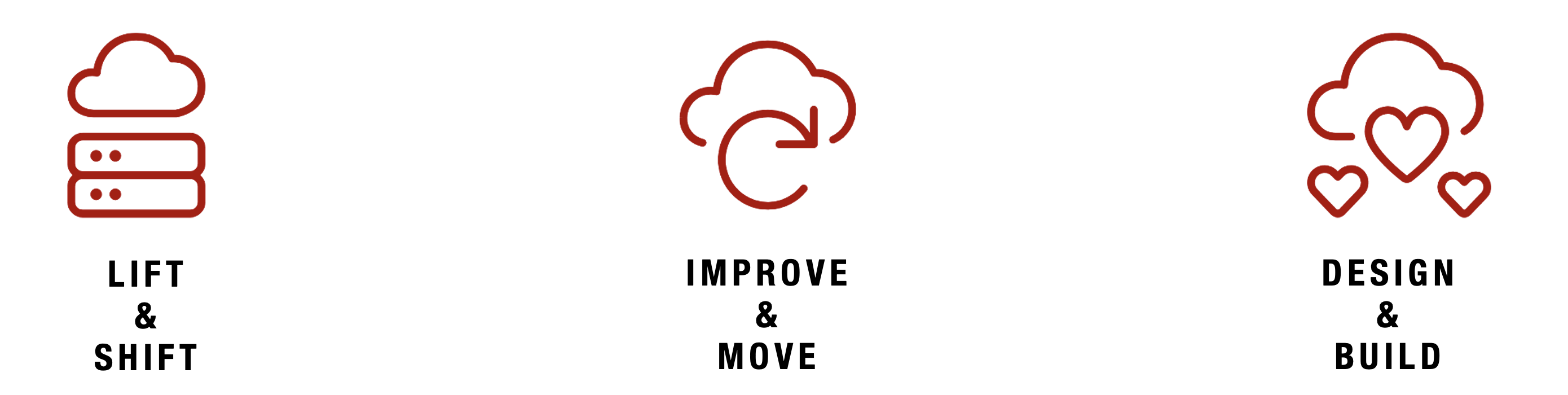These three models illustrate different stages of cloud use. You can start by just moving your current systems as they are (βLift & Shiftβ), then make some improvements while driving (βImprove & Moveβ), or go further by entirely redesigning everything to work best in the cloud (βDesign & Buildβ).