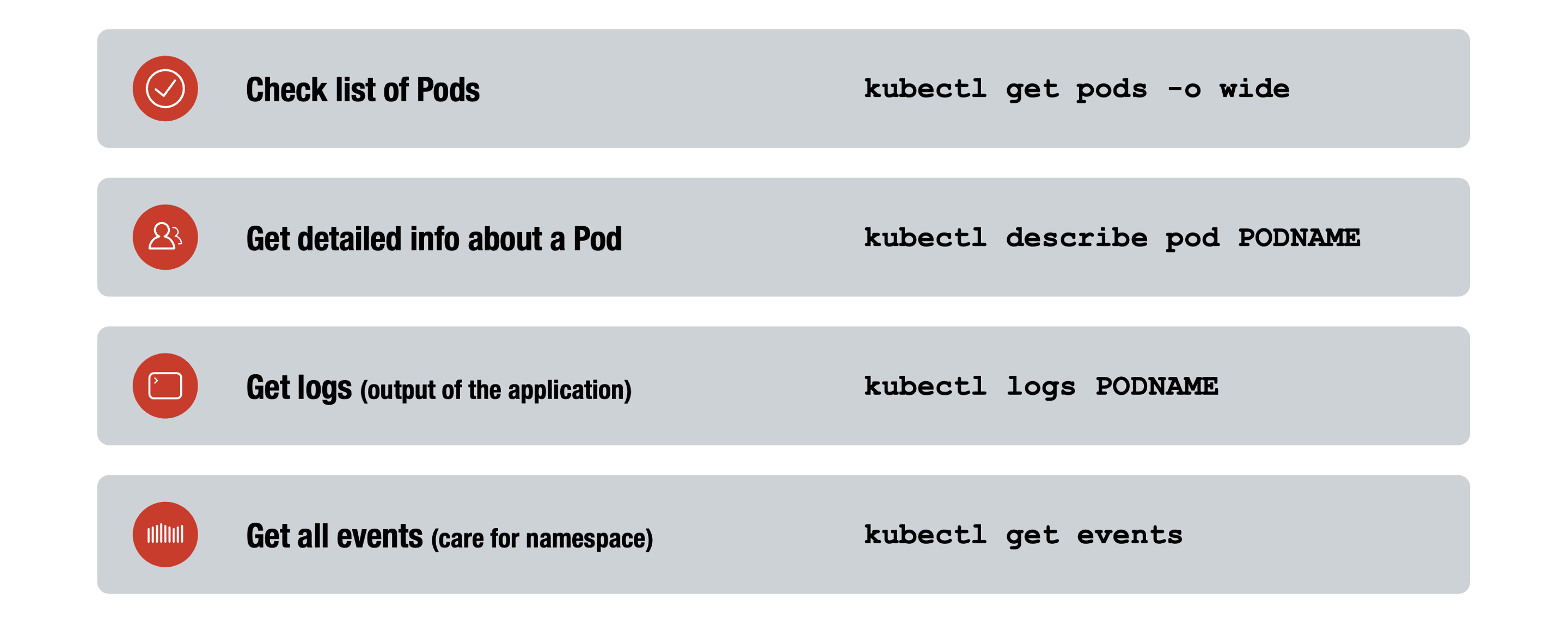 Together, these commands give fast insights into Pod health, resource relationships, and recent changesβkey for identifying and resolving issues in Kubernetes environments.