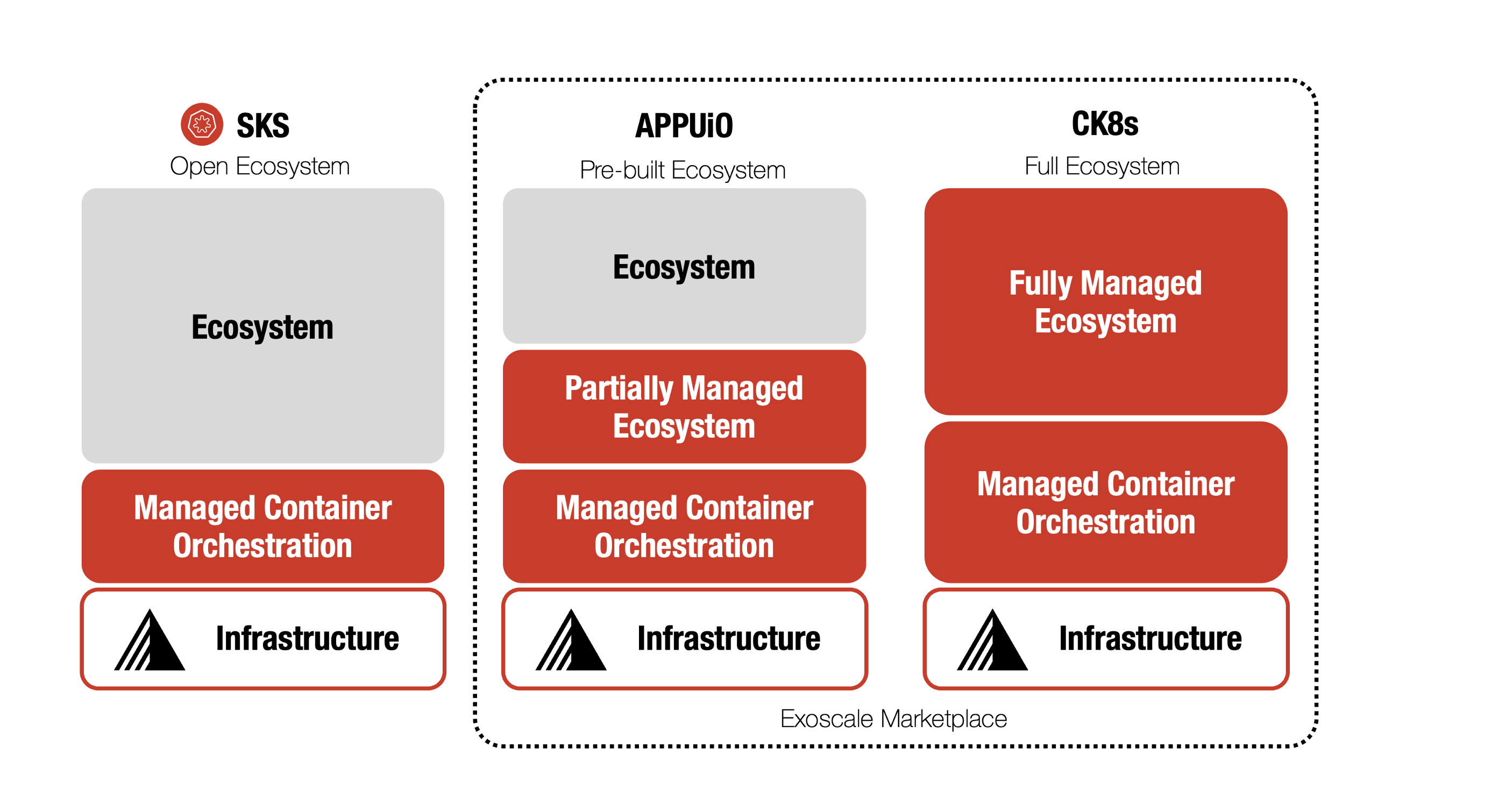 Exoscaleβs SKS is a managed, vanilla Kubernetes service thatβs easy to upgrade and highly flexible. You can launch clusters in seconds and manage them via portal, CLI, API, or tools. SKS covers the full lifecycle of the control plane and nodes. - APPUiO